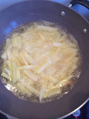 土豆炸好后锅里留底油,放入干辣椒,孜然粒,八角小火炒出香味,出香味后大火放入火锅料继续翻炒