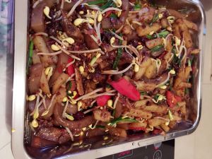 好了,鱼盘下面放电磁炉火开到最小,就可以先吃上面的菜的,等鱼在焦一点更好吃
