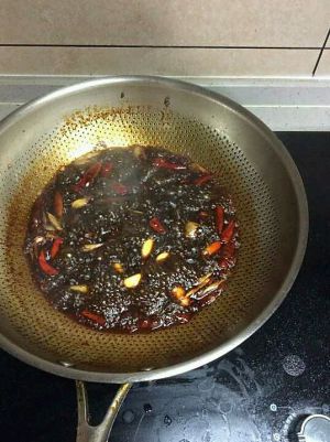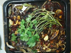 炒好的配料盖在烤好的鱼上面,上面放入干辣椒节,蒜子,葱花