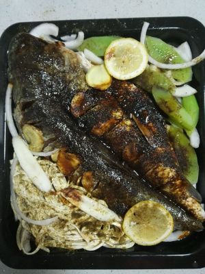 菜洗干净,豆腐皮,莴苣焯水,洋葱垫底,鱼洗干净,料酒葱姜柠檬片腌上,半个小时,放到烤盘里,孜然花椒粉撒上,油涂上酱油,预热烤箱10分钟,进烤箱烤25分钟