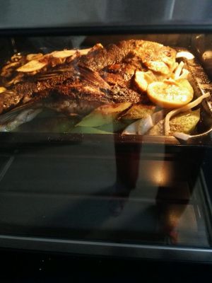 鱼已经处理过了,回家进行清洗之后,姜丝、大葱,料酒、盐抹匀,腌制10分钟) 将腌制好的鱼放入烤盘(上下火210度15分钟)