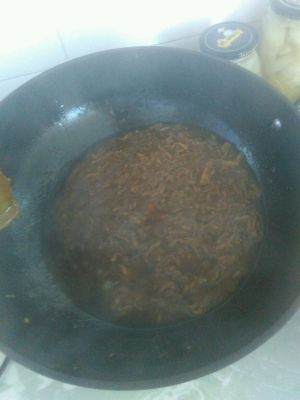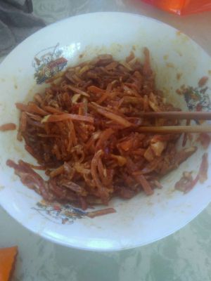 锅烧热下油,放入淹好的肉丝,炒至5成熟,加入老抽 盐 鸡精 醋几滴。淀粉勾汁,看着有酱的效果就可以了