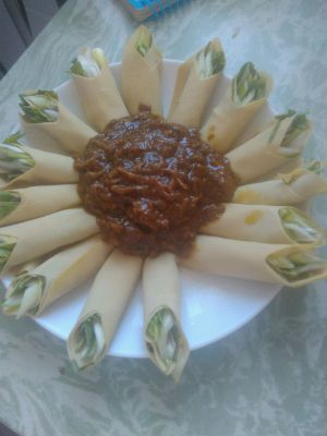 把肉酱浇到备好的干豆腐上