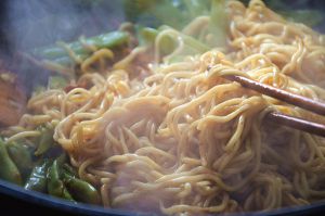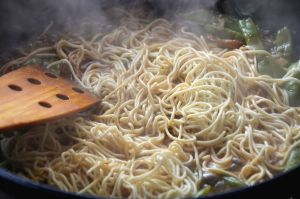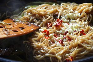 这个时候可以把火调小,然后开始用油抓面条,面条要买细切面