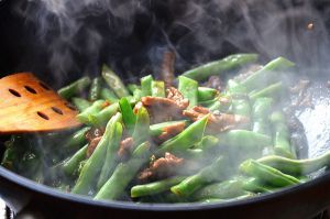 启锅,加油,葱姜炒香,倒入排骨炒出油,所以特意选了几块肥一点的。依次加入青椒,芸豆。翻炒至七八成熟,颜色变绿。