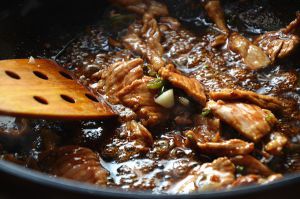 翻炒肉片时调入生抽、老抽、白糖、盐;