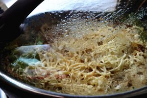 开盖,把面和菜翻均匀,加鸡精,即可出锅啦。
