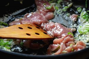 放入肉片快速翻炒至肉变色,倒入黄酒、生抽和老抽