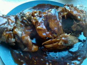 油烧开 提起鱼尾放入油里炸 先炸下鱼头 然后浇油淋到鱼身 再慢慢放进锅里炸 这种还是需要多尝试才能掌握好 我第一次炸的有点不成鱼样-_-|| 然后鱼炸到金黄捞出摆盘 然后用一点油 将切好的葱姜蒜末下锅炒香 然后再放入芡水 大火收下汁