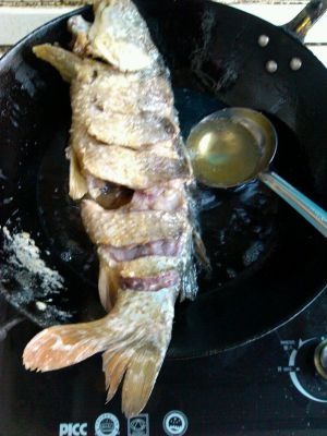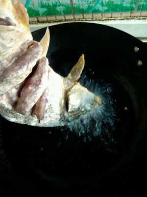 锅内加油烧至7成热,先将鱼头下锅炸过后,再将整鱼下油锅。