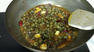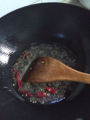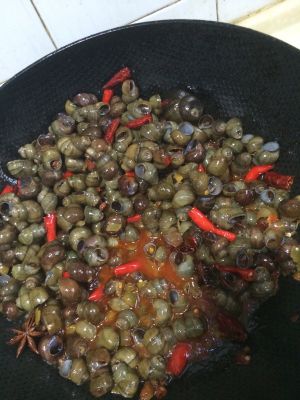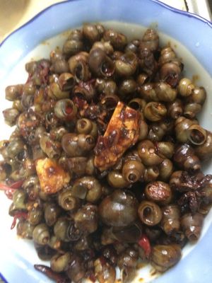 待油热,干辣椒姜片炒香,片刻后加入田螺翻炒。