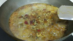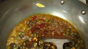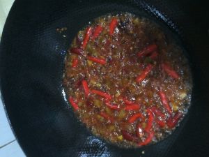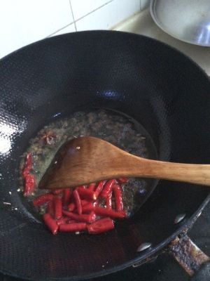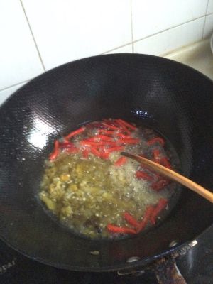 淀粉调水倒进吵开,辣椒末放进,最后装盘