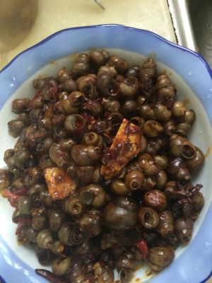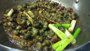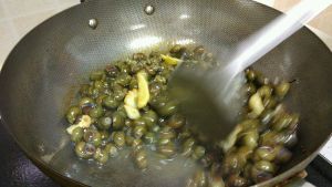 捞起洗净,放油至锅热七分,生姜田螺倒进爆炒,放盐米酒,少许酱油,还有白糖,味精少许,