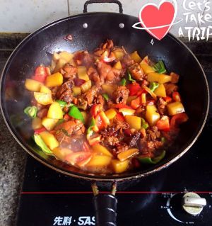 大火收汁,加入青椒红椒翻炒3~5分钟