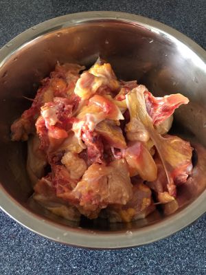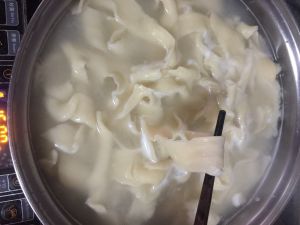 扯面可以直接垫于锅底,也可将扯面过凉水乘碗里,吃面条时再拌入大盘鸡内。(扯面做法见我下篇食谱)