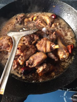 鸡肉焯水(放入生姜,葱段)鸡肉变白捞起过凉水,热油放白糖,变成黄色后放入鸡肉翻炒,待上色之后放老抽,干辣椒,然后放入啤酒(刚好淹没过鸡肉就好)