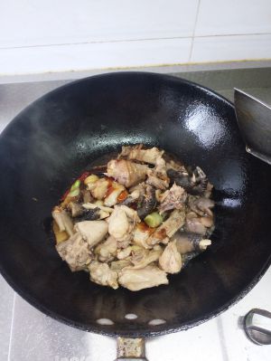 2.锅中倒少许油,放辅料,在锅里煸炒,微香后,倒入鸡块翻炒,放入老抽,上色,慢炖即可