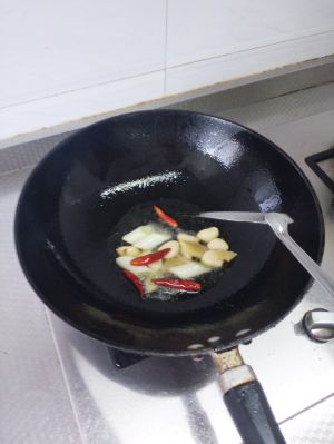 锅里倒油烧热,放入蒜头,干辣椒,花椒,剩余姜片,葱段爆香。