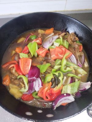 土豆开始变软,加入青红椒圆葱,加入适量盐稍煮一会即可。