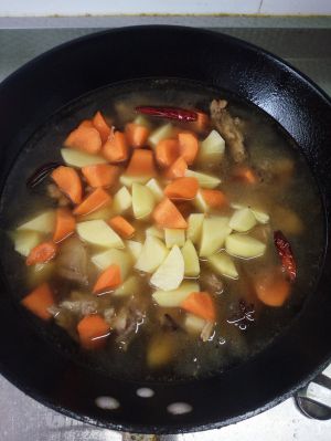 加入土豆胡萝卜,加入适量水没过鸡肉中火炖煮。