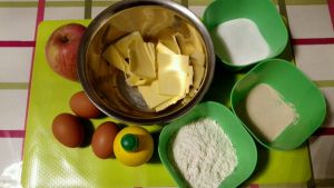 四、把做好的苹果和柠檬放一起,把110克黄油放微波炉融化搅拌成奶油状,放一起。再将两个鸡蛋和一个蛋黄搅拌充分放入。