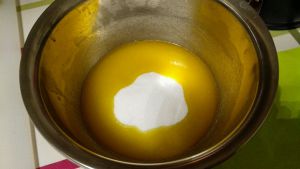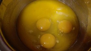 加入3个鸡蛋,拌匀;筛入面粉,拌匀;放入酵母,搅拌均匀,发酵30~40分钟。
