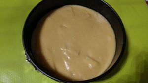 把混合好的蛋糊轻轻倒入刚冷藏过的烤碗,铺满青苹果薄片。这里说下,因为青苹果带酸味,用青苹果做甜品会清甜爽口一些,而且用柠檬汁浸泡过,就算烤好出炉都能维持果肉的本色。