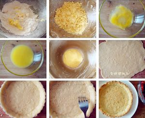二、派皮: 1、面粉和糖一起过筛到盆里,加入软化的黄油,用手搓成粗玉米粉的状态。 2、蛋黄、冷水、盐混合均匀(使盐完全溶解),倒入第1步的面粉中,轻轻揉成面团。然后放冰箱中冷藏4小时以上(如果时间不够,也至少冷藏1个小时)。 3、冷藏好的面团取出,擀成薄片,盖在派盘上,用擀面杖滚过派盘,切断多余的边,除去多余的边角。 4、在派盘底部用叉子叉一些孔(防止烤的时候底部鼓起),放进预热好的烤箱,中层,210度,25-30分钟,至派皮表面微黄,质地酥脆即可。 三、合成: 烤好的派皮冷却后,填入馅料即成。 Ps:如果不马上吃,尽量不要过早填入馅料,在吃前填入就可以,以保持派皮酥脆。