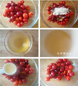 樱桃馅的制作: 300克新鲜樱桃洗净去核,加入25克糖,盖上盖腌制2个小时以上。