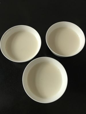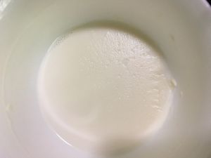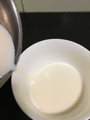 然后将牛奶液沿着碗边缓缓倒回碗里,奶皮回浮起来。