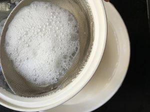 奶膜抬起 倒出3/4牛奶 倒入蛋清液 筛两遍 倒回奶膜