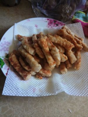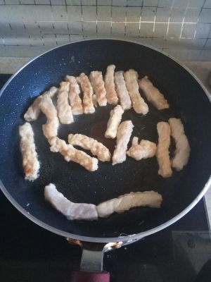锅内油8成热时将肉一条一条的下锅大火炸,炸的过程中不要翻动,以免裹的浆脱落,成型后肉会浮起来。