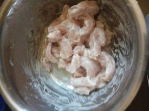 里脊肉300克切成0.5mm的长条,2克盐,1勺料酒先码味