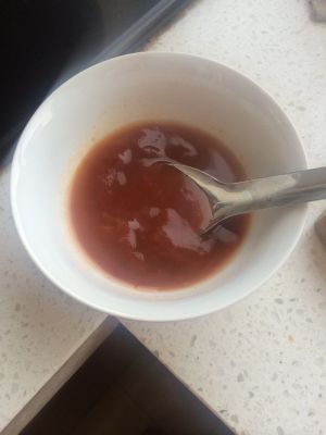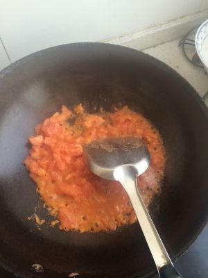 锅里放番茄酱,白糖,少量醋,半碗水,一起熬滚以后,煮一分钟