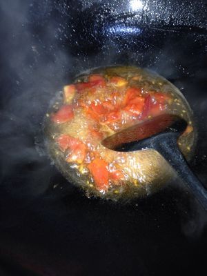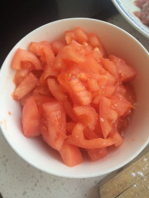 将西红柿去皮切碎(西红柿穿在筷子上在火上烧几秒钟,皮自动吐噜)