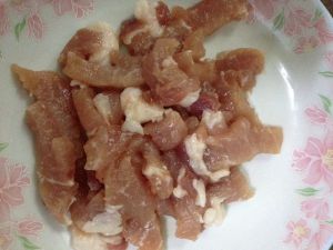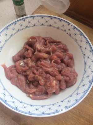 瘦肉切小拇指粗细长条,加盐,鸡精,料酒,少许酱油腌制半小时
