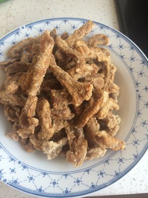 这个步骤忘记拍了。油烧七成热,腌好的肉沾上面糊炸至金黄,稍放一会后复炸一次
