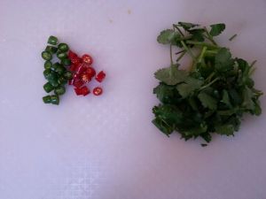 青红辣椒各1根,如果不喜欢吃辣,辣椒可以不放。香菜清洗干净后切段。