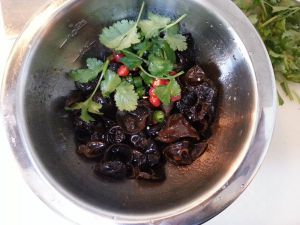 葱,小米椒,罗勒切碎和黑木耳一起放糖,醋,生抽,少量味精和香油拌匀,家里还有芥末油,毫不犹豫的倒入数滴,够冲。