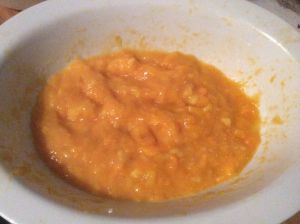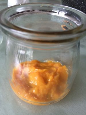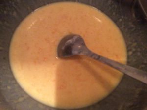 拿一只干净的小锅,倒入500ml的芒果汁,小火加热后加入吉利丁片,不用烧开,微微冒泡就好了。在这里可以适当加一点糖。加入吉利丁片后顺时针方向慢慢搅拌,直到全部融化。