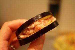 将酿入了肉馅的茄盒蘸一蘸鸡蛋糊,完全裹。