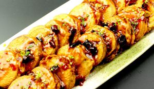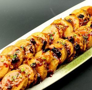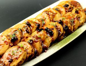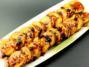 浇汁儿:将鱼香汁儿浇在炸好的茄盒上,即可。