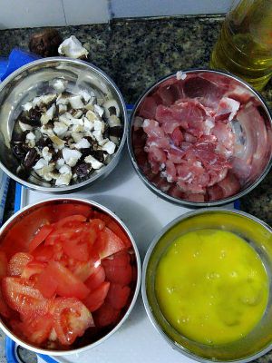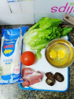 西红柿去皮切片,鸡蛋打散,猪肉切片,香菇掰一小块