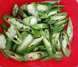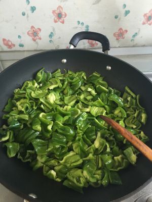 然后放入青椒炒均匀,在根据个人口味放入盐