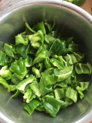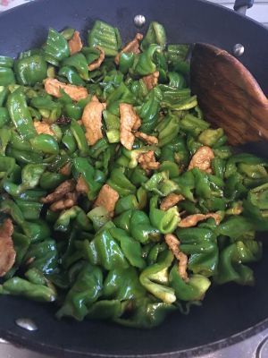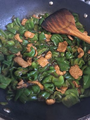 等青椒都蹋软了以后放入少许鸡精和香油。出锅啦。