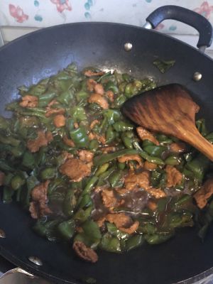 五花肉均匀的裹上甜面酱后,放入青椒丝翻炒,关火,加盐