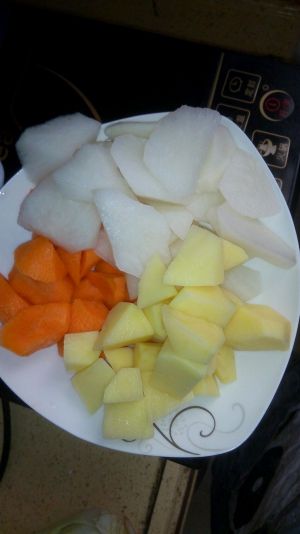 分别把土豆、胡萝卜、白萝卜滚刀块切