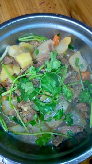 慢炖好后加入切好的土豆和胡萝卜,待把土豆和胡萝卜炖熟时加入切好的青椒,待汤汁浓稠时加盐调味,最后加入鸡精翻炒均匀即可
