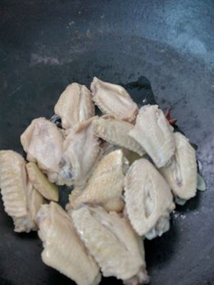 3.再切一部分葱段,姜片,蒜块备用,放少许油(鸡翅本身就会出油,多了会油腻)爆香葱姜蒜,放入鸡翅,煸炒至金黄。
