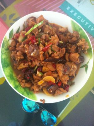 把鸡剁成小块,这样好入味,用水绰一下,水沥干,锅里放油烧热,放入生姜鸡爆炒,炒的颜色变了加入桂皮八角香叶草果